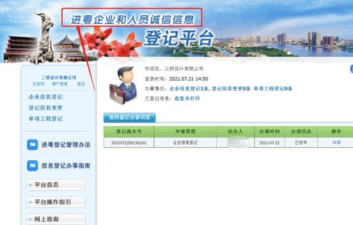 在2021年7月21日,在广东备案传来了好消息:广东省政务网查询结果显示广东省住建厅已经发布了三桥设计院的备案公告,意味着本院在广东备案成功!